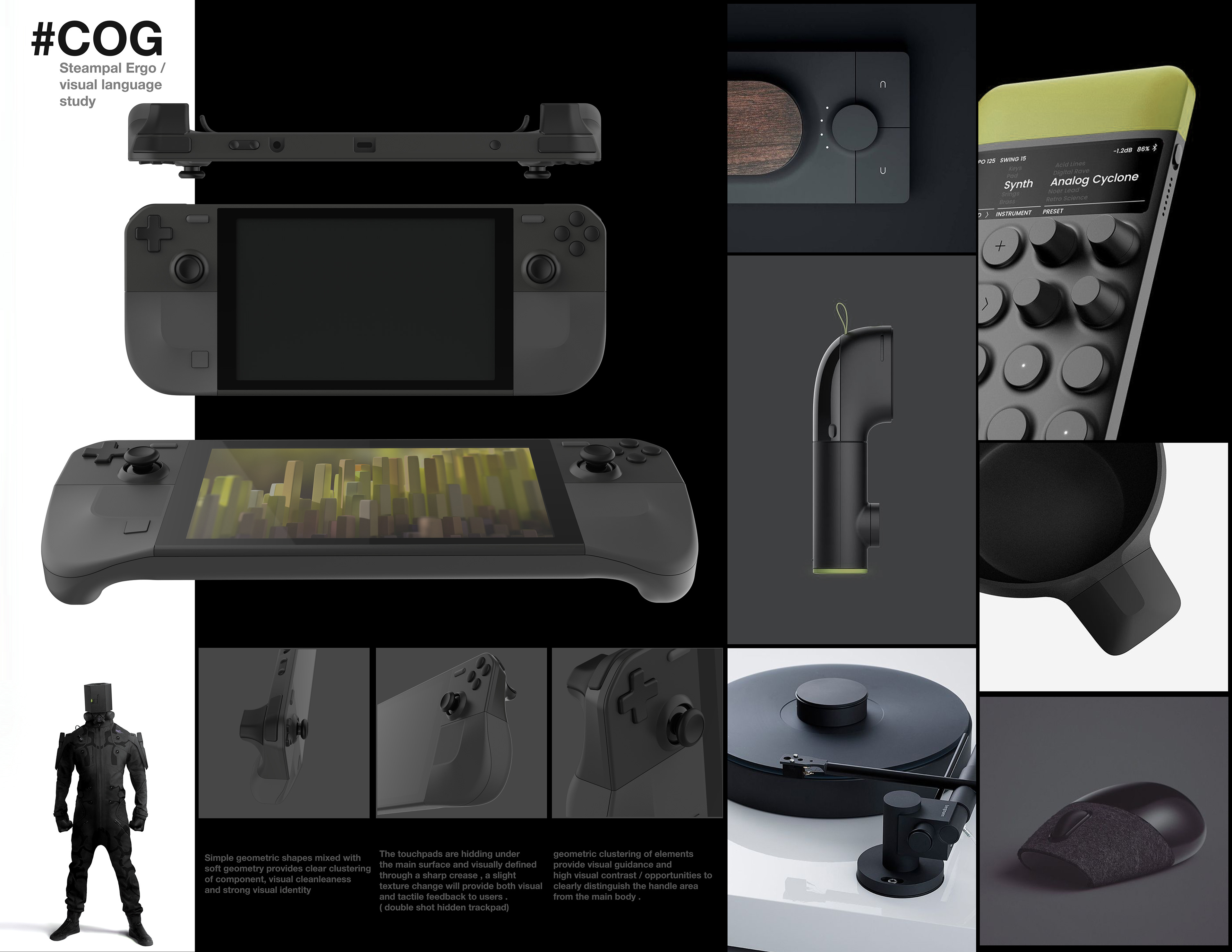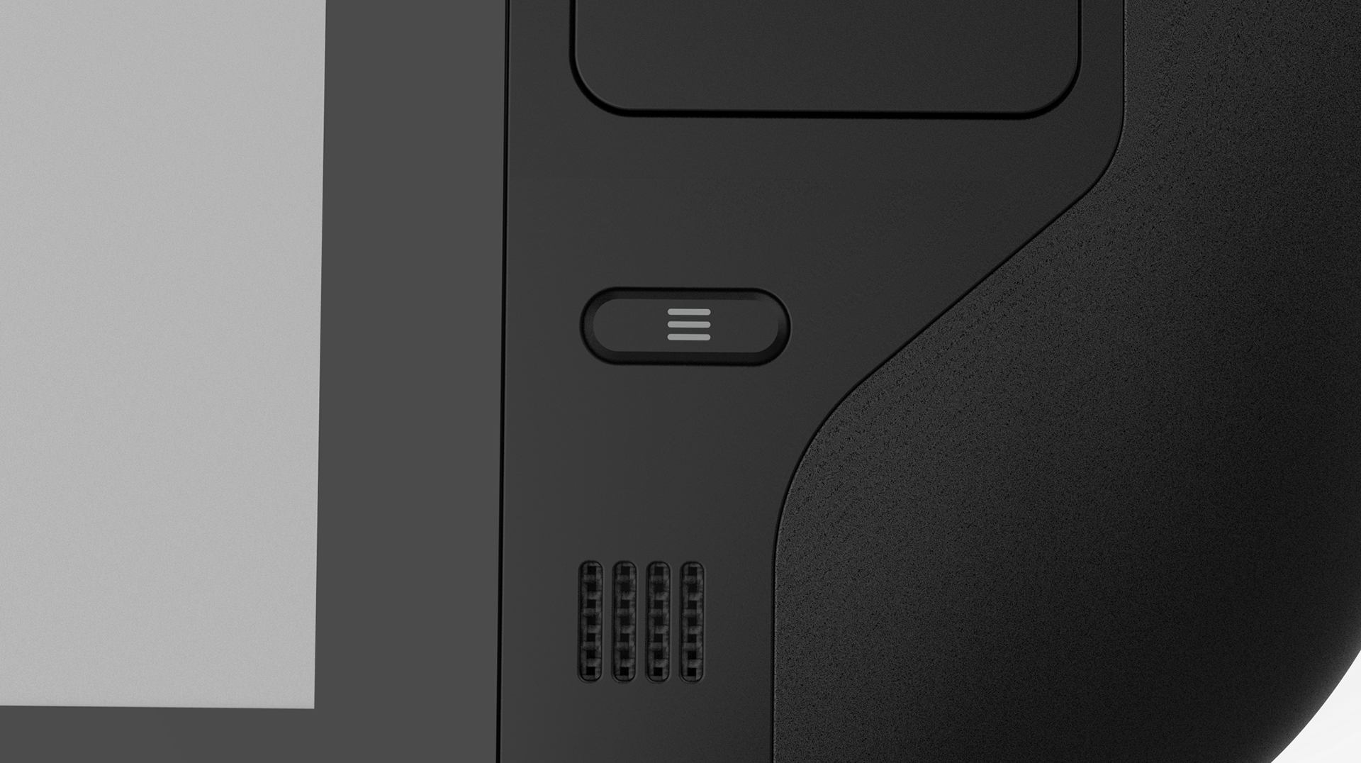 -Creating a clear relationship between UI and HW / high contrast readability and UI color consistency between HW and SW Black and light grey hardware CMF compliments SW UI while leaving on-screen content as the primary contrast.